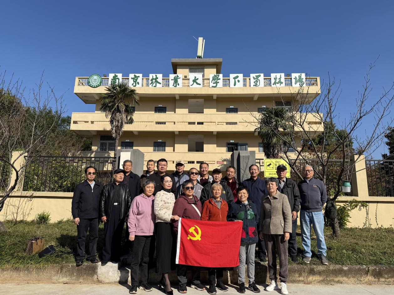 随后,老党员开启生态研学之旅,沿蜿蜒林间步道前行,深入探访以栎类次生林为主的天然林区,近距离观察金钱松、南京椴等珍贵树种。途中,曾参与学校林业相关工作的老同志结合自身经历,为同行者讲述林业科研艰辛历程,让此次参观成为一堂生动的实践党课。