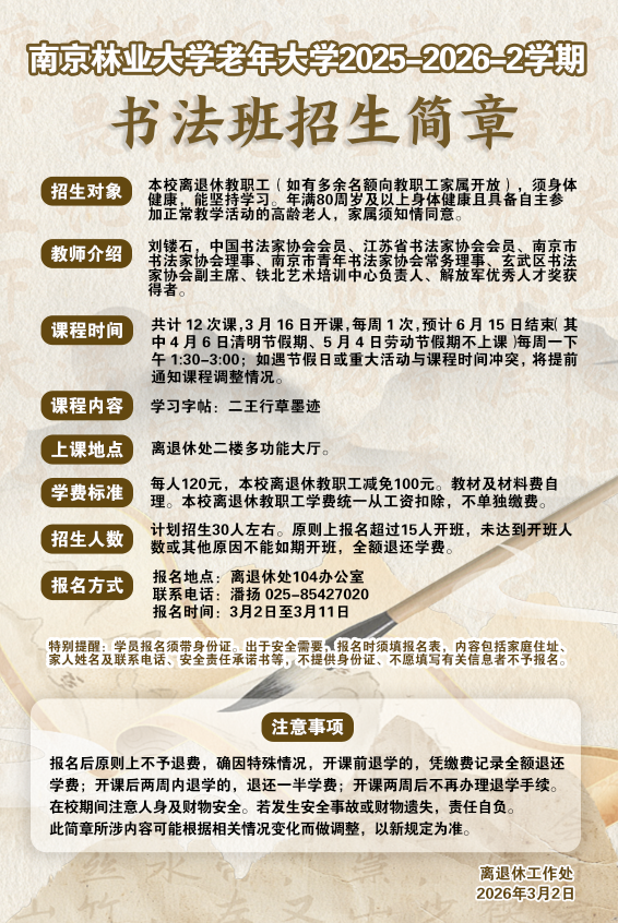 南京林业大学老年大学2025-2026-2学期书法班招生简章